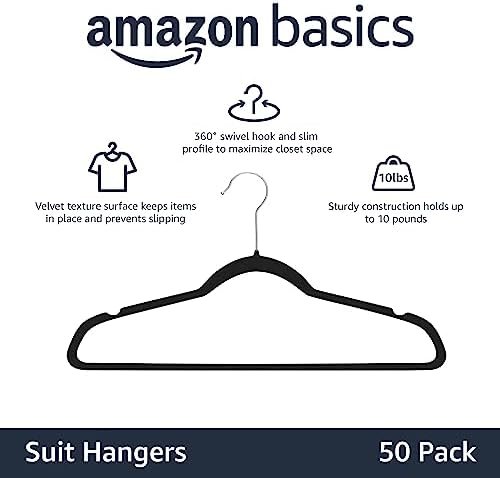 Amazon Basics Slim, Velvet, Non-Slip Suit Clothes Hangers, Pack of 50, Black