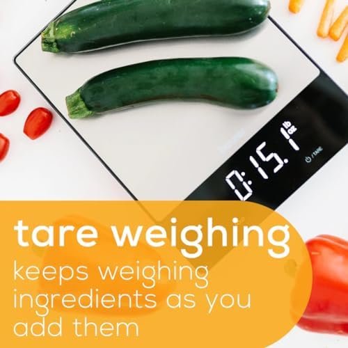 PRECISE MEASUREMENTS: The KS34 kitchen scale measures in pounds, ounces, kilograms, and grams with precision – the tare function lets you keep weighing ingredients as you add them