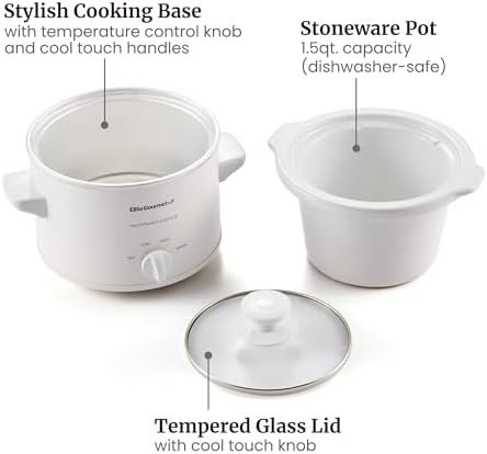 The Elite Gourmet 1.5Qt. Mini Slow Cooker is perfect for cooking and serving small one-pot meals and appetizers such as soups, stews, meatballs, dippings, and sauces. It’s a great kickoff for a fondue party or where everyone prepares their favorite dip in their 1.5Qt. Mini Slow Cooker. This versatile little appliance can be a single person’s best companion as well the all-star at your next Superbowl party. It features low and high temperature settings, a keep-warm setting allowing you to keep your meal hot and fresh before it’s served and an attractive white finish. It includes a removable inner stoneware pot that’s easy to clean, a tempered glass lid with metal rim for easy viewing of cooking cycle and cool-touch handles and knob for safe handling.