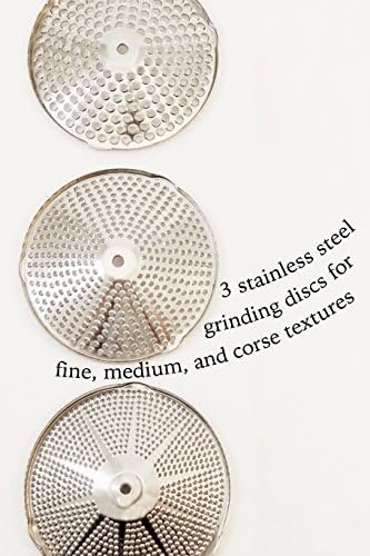 It includes 3 Stainless Steel grinding discs for fine, medium, and coarse textures