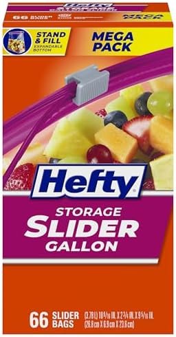 GALLON PLASTIC BAGS FOR FOOD STORAGE: This pack includes 66 gallon size Hefty Slider Storage Bags