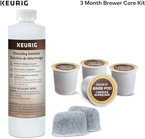 Cleaning your coffee maker regularly is an important step to extend the life of your brewer and keep your beverages tasting their best. The 3 Month Brewer Care Kit has everything you need to regularly clean and maintain your brewer for 3 months. The Keurig 3 Month Brewer Care Kit includes 1 bottle of Keurig Descaling Solution, 2 Water Filter Cartridges, and 4 Keurig Rinse Pods. The 3 Month Brewer Care Kit is compatible with all Keurig coffee makers. If you have a Keurig K-Mini or K-Mini Plus brewer, we recommend that you consider our Keurig Cleanse Kit which only includes Keurig Descaling Solution and Keurig Rinse Pods as the K-Mini brewers do not use Water Filter Handles.