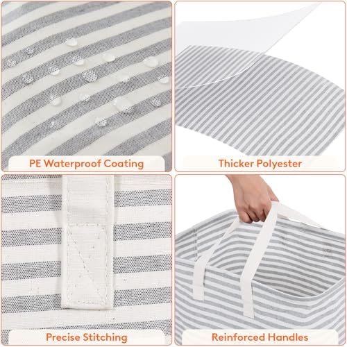 Premium Material: The foldable clothes basket is made from thick polyester and primuin cotton. The interior features PE waterproof coating can keep stored items dry. Simply use a wet cloth to wipe off the dirt. Do not clean it in washing machine and dryer, as doing so may damage the leakproof PE coating.