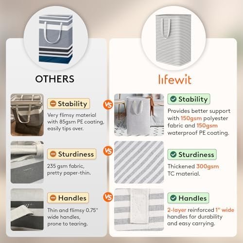 Reinforced Handles: The 2 handles are reinforced with strong stitching and are long enough for carring with 1 or 2 hands. While full of items, our large hampers for laundry can also be easily carried up and down stairs or to a laundromat with ease.