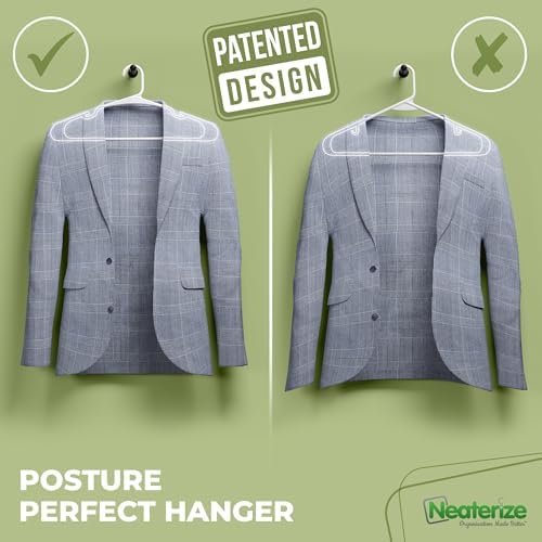 ★ PATENT PENDING UNIQUE DESIGN: Discover the game-changing hanger shape by Neaterize, designed to prevent the dreaded slump of suits and dresses. Our patent-pending design guarantees that your clothes hang flawlessly, maintaining their pristine condition and alignment exactly as you arranged them. Plus, a clever notch caters to those sleeveless garments in your closet. Measures 15.9’’ x 7.4’’ x 0.22’’ and is available in packs of 16, 30, 50, or 100 – we mean it when we say we’ve got you covered!