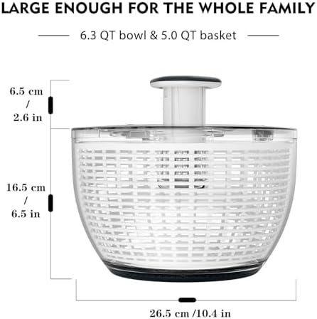 Large Enough for the Whole Family Use: The large size of the vegetable spinner means you can process enough vegetables for the whole family at once, the capacity of the bowl is 6.3 Qt, and the basket is 5.0 Qt